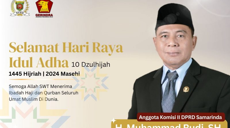 SAMARINDA – Anggota DPRD Samarinda dari Partai Gerindra Muhammad Rudi menyampaikan ucapan Hari Raya Idul Adha 1445 Hijriyah tahun 2024.